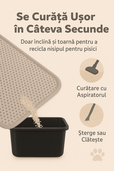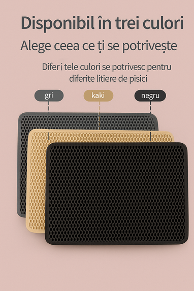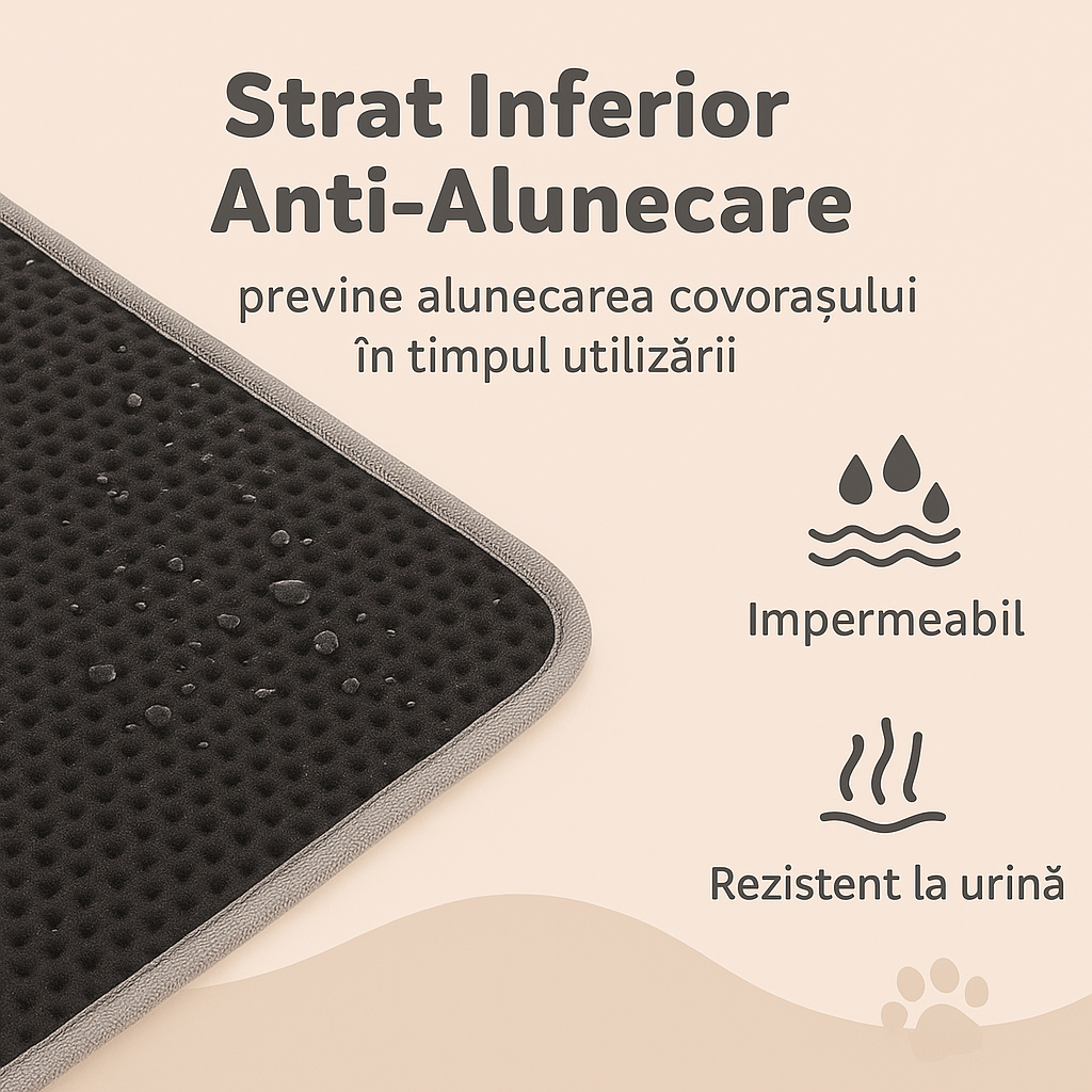 Spune adio gunoiului împrăștiat! Acest covoraș anti-gunoi îți menține casa curată, oferind în același timp un spațiu confortabil pentru prietenul tău felin. Material moale pentru labe sensibile. Ușor de curățat, agitat sau clătit. Bază antiderapantă pentru stabilitate maximă. Design elegant care se potrivește oricărui decor.